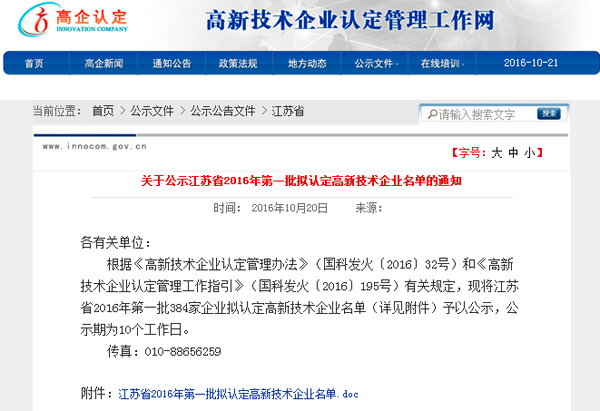 20161021日,江蘇省2016年度首批認定的高新技術企業名單公布(見附件309號),包括南京科進實業有限公司在內的384家企業榜上有名。