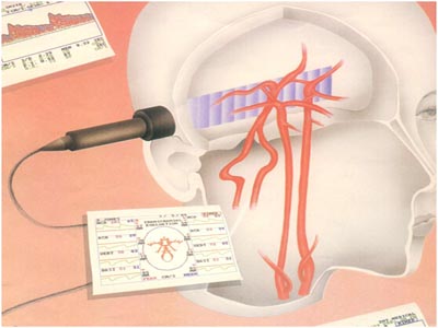 利用2MHz的低發射頻率與脈沖多普勒技術結合,通過顱骨特定的聲窗, 獲得顱底主要動脈生理及病理的血流動力學參數的無創性腦血管檢測方法。